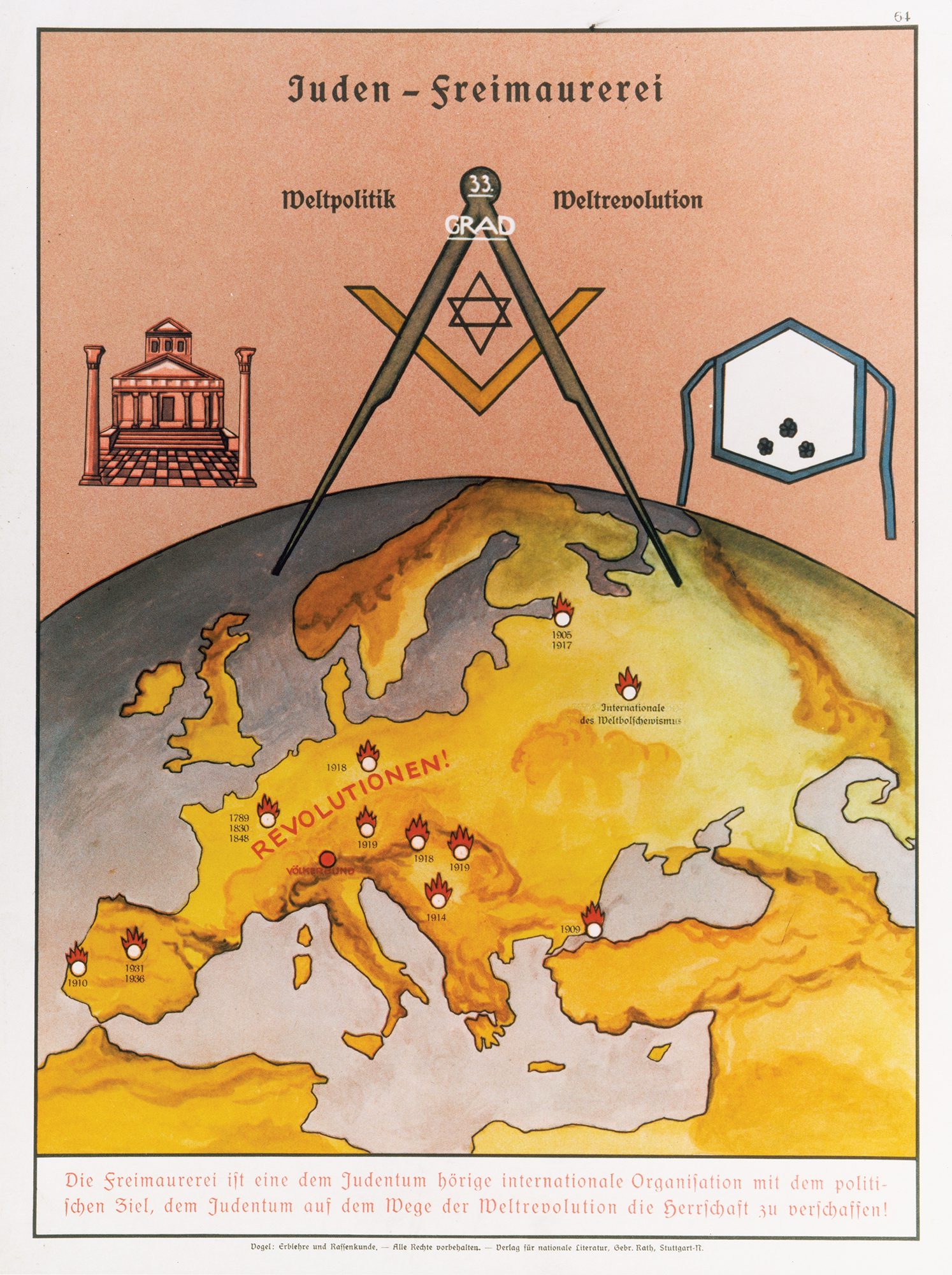 Above: A 1935 Nazi Propaganda Poster linking Freemasonry with ”the political goal of establishing Jewish domination through worldwide Revolution,” according to the text at bottom of image.