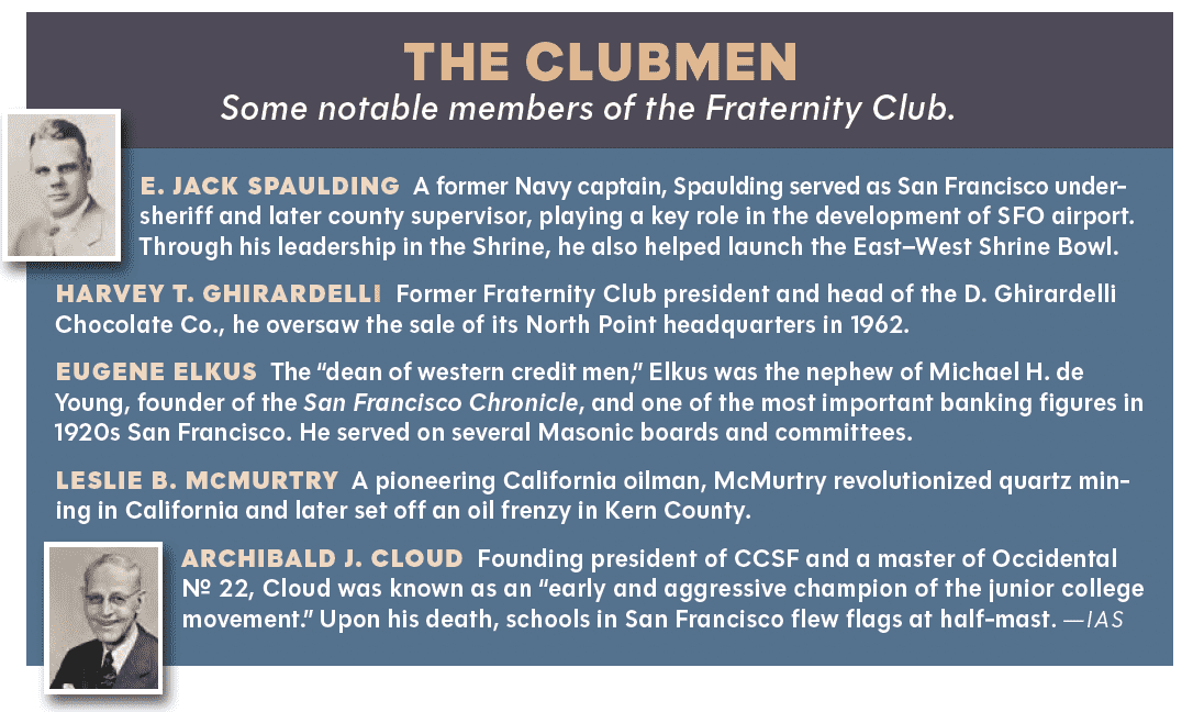 It was an ignoble end to what for almost half a century had been one of the most important—and lavish—centers of fraternal life on the West Coast. The Fraternity Club, originally called the Masonic Club, operated from 1916 until 1961 from suitably gilded digs at the Palace Hotel, and later at a Financial District clubhouse, providing its roster of nearly 2,000 members with a home away from home—and also away from lodge. There, the club brought together Masons primarily from the Bay Area, but also from farther afield, to hear speakers on current events, to socialize and network, and to wine and dine. In many ways the club, which included a who’s who of San Francisco movers and shakers (including, among its charter members, the banking magnate William H. Crocker; William P. Filmer, sovereign grand inspector of the Scottish Rite and first president of the Golden Gate Bridge District; and San Francisco postmaster Harry L. Todd), was the embodiment of the proverbial smoke-filled back room.